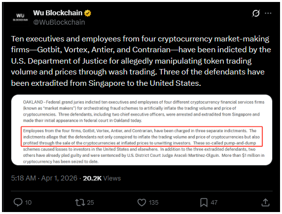 A vádemelések 2025. március 30-án történtek, amikor szövetségi esküdtszékek több ügyben is vádat emeltek olyan cégek vezetői és alkalmazottai ellen, mint a Gotbit, a Vortex, az Antier és a Contrarian.
