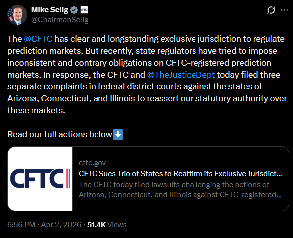 A CFTC és az US Department of Justice külön pereket indított Illinois, Connecticut és Arizona ellen, miután ezek az államok korábban felszólították a predikciós platformokat, például a Kalshi és a Polymarket működésének leállítására.