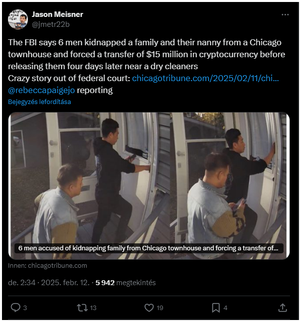 Egy hollywoodi krimibe illő emberrablási ügy rázta meg Chicagót, és hat férfit vádolnak azzal, hogy elraboltak egy családot és dadájukat, majd kriptovalutában követeltek 15 millió dolláros váltságdíjat.