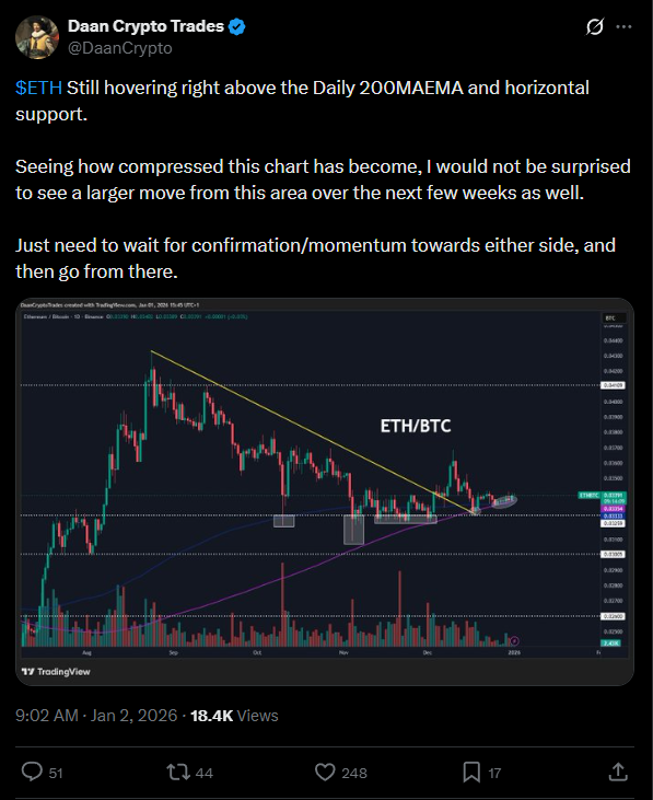 Daan Crypto Trades elemző szerint a grafikon erősen összeszűkült, ami egy jelentős elmozdulás közeledtét jelezheti.