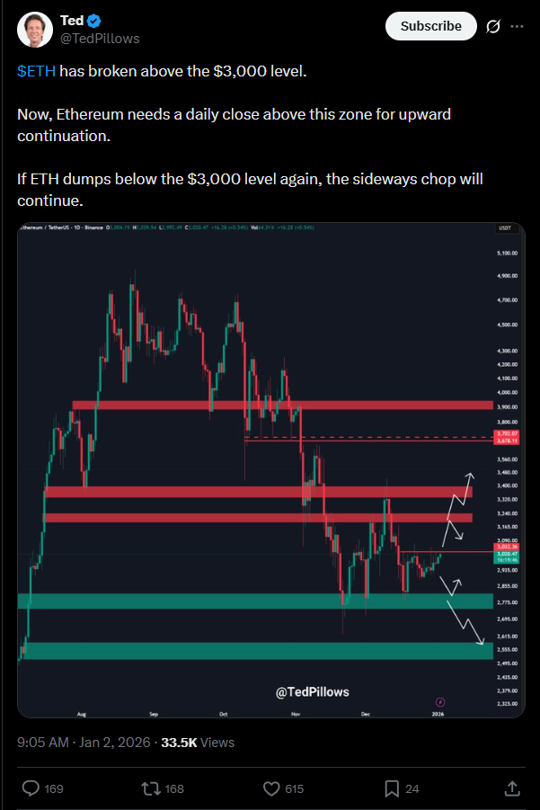 Jelenleg az ETH próbál stabilizálódni, ára 2026 január elején körülbelül 3020 dollár.