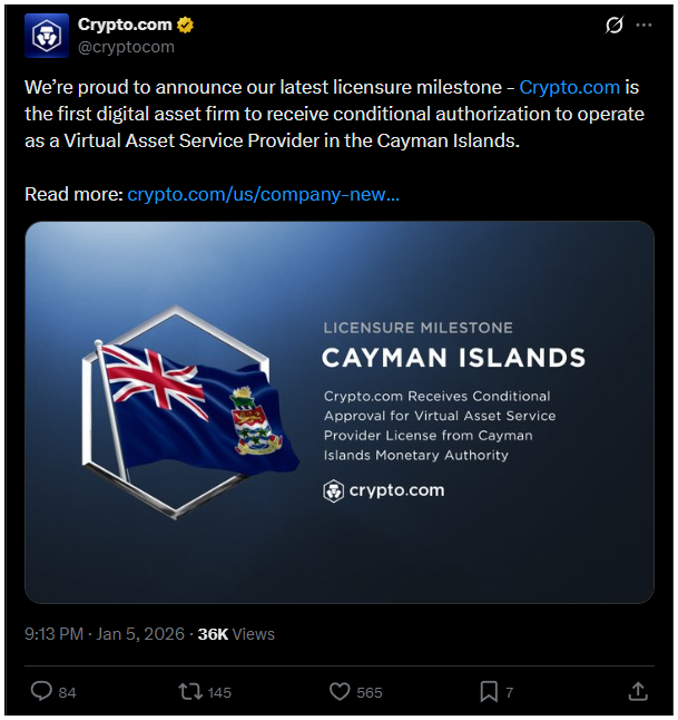 A Crypto.com fontos mérföldkőhöz ért. Ez az első, digitális eszközökkel foglalkozó cég, amely feltételes jóváhagyást kapott a Kajmán-szigeteki Monetáris Hatóságtól a Virtuális Eszközszolgáltatói (VASP) engedélyhez.