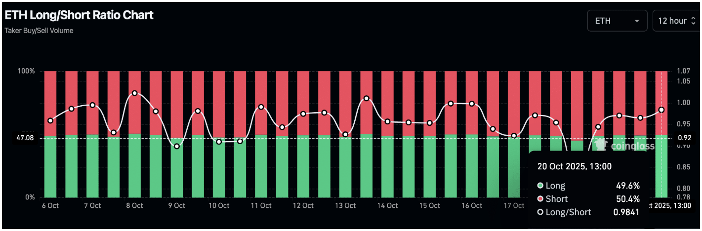 A masszív short pozíció jól tükrözi a piaci hangulat változását. A Coinglass adatai szerint az Ethereum long/short aránya jelenleg 0,98, azaz a tőkeáttételes pozíciók 50,4%-a short.