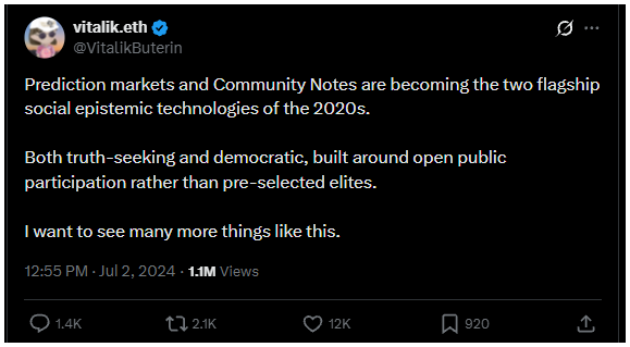 Abban az időszakban Buterin nyilvánosan dicsérte az előrejelző piacokat mint a kollektív igazságkeresés új eszközeit. „Társadalmi episztemikus technológiáknak” nevezte őket, amelyek a „nyílt részvételt” ösztönzik, nem pedig a „kiválasztott elit” véleményére támaszkodnak.