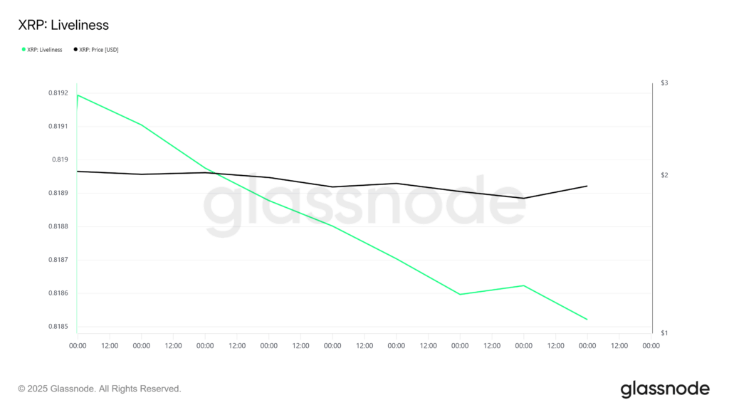 Az XRP úgynevezett liveliness mutatója az elmúlt napokban csökkent, ami azt jelenti, hogy kevesebb régi érme mozog a hálózaton.