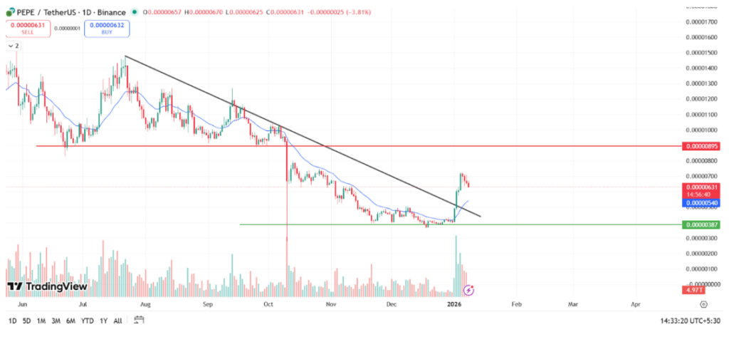 2026 elején a PEPE újra magára vonta a piac figyelmét. Alig egy hét alatt több mint 50 százalékot emelkedett, miközben a legtöbb mémcoin továbbra is bizonytalan környezetben mozog.