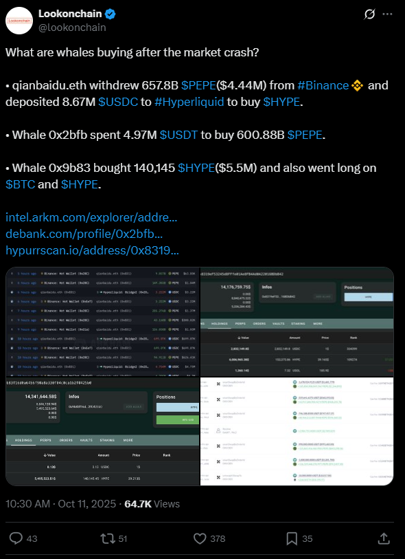 A legfrissebb Lookonchain adatok szerint a nagybefektetők, vagyis a „bálnák”, újra aktívan vásárolják a HYPE és PEPE tokeneket — miközben a piac nagy része még mindig bizonytalan.