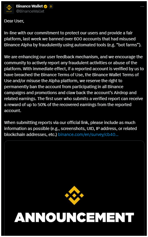 Emellett a Binance Alpha eseményeken szerzett bevételeket is visszavonják.