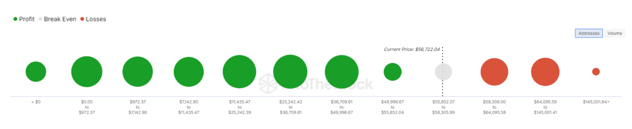 A Bitcoin a cikk írásakor 56.685 dolláron kereskedik. 1,51 millió bitcoin cím van 618.430 BTC együttes birtoklással, akik az 55.852 és 58.305 dollár közötti árfolyam között vásárolták az eszközt. Ezen tárcák a nullszaldós ponton vannak.