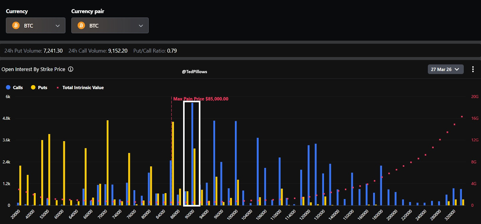 A Bitcoin körüli hírek egyértelműen kirajzolódó opciós struktúra köré sűrűsödnek a 2026. március 27-i lejárat előtt.
