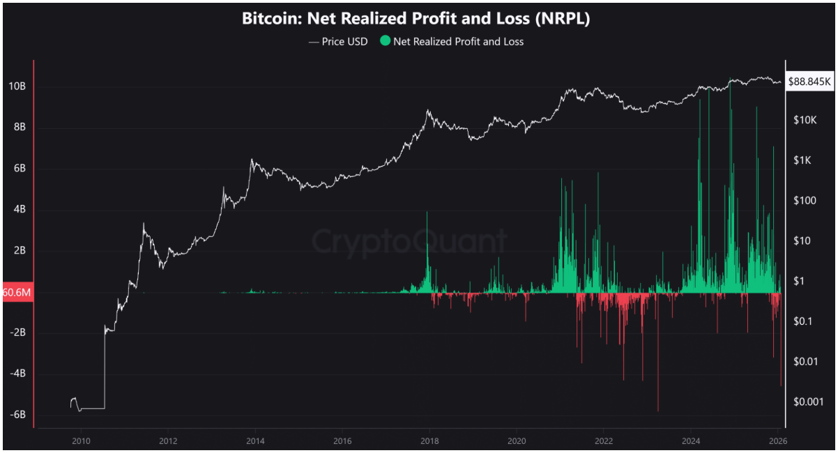 A CryptoQuant adatai szerint a Net Realized Profit/Loss, az úgynevezett NRPL mutató alapján nagyjából 4,5 milliárd dollárnyi veszteség halmozódott fel az elmúlt időszakban.