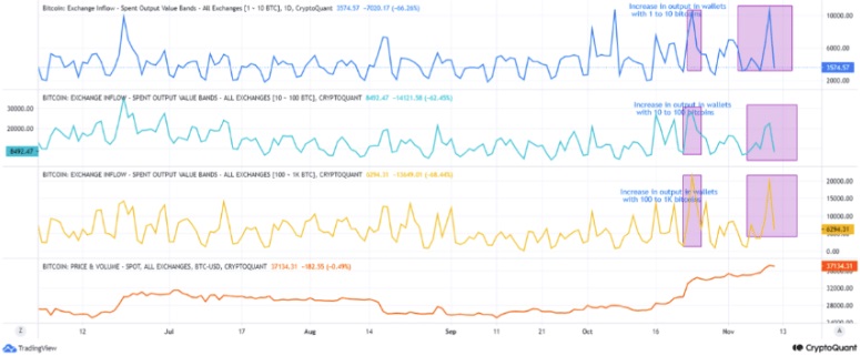 Az 55.000 tőzsdére küldött BTC egy részét is 1 BTC és 1000 BTC közötti címek utalták át.