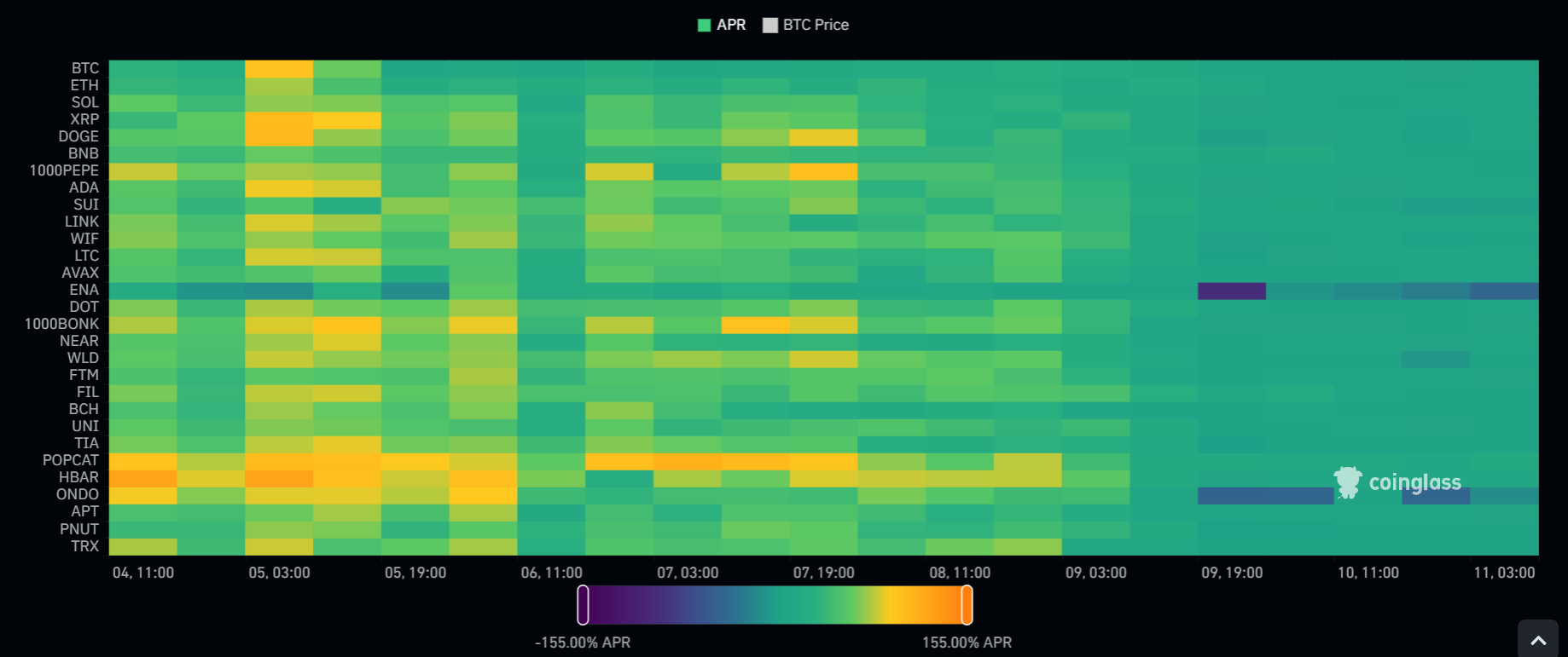 A múlt heti finanszírozási rátákkal ellentétben, amelyek két számjegyűre szöktek (narancssárga szintek), az elmúlt két napban 10% alá csúsztak.