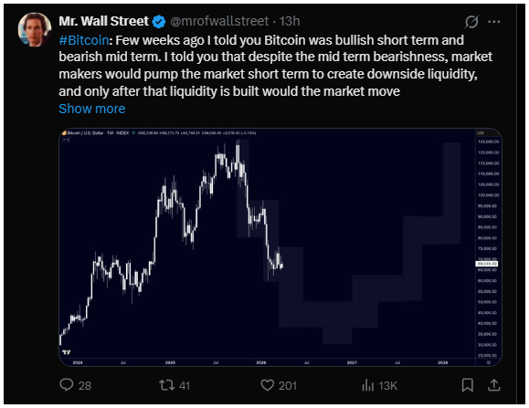 A Bitcoin 60.000 és 76.000 dollár közötti, nagyjából 27%-os emelkedését már nem valódi keresletnek, hanem inkább likviditásgyűjtésnek tartja, amely során a nagy szereplők lehetőséget teremtenek egy későbbi esésre.