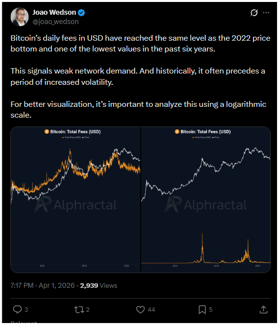 A fundamentumok sem mutatnak erőt. João Wedson, az Alphractal alapítója arra hívta fel a figyelmet, hogy a Bitcoin hálózatán keletkező napi tranzakciós díjak dollárban mérve olyan alacsony szintre estek vissza, amelyet legutóbb korábbi piaci mélypontok idején lehetett látni.