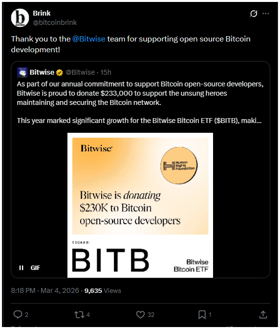 A Bitwise bejelentette, hogy 233.000 dollárt adományoz a Bitcoin fejlesztőinek támogatására.