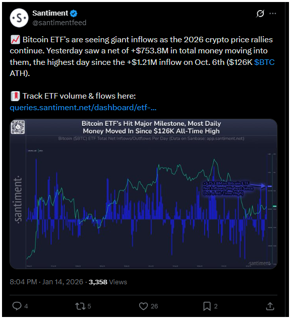 Különösen figyelemre méltó volt a keddi nap is, amikor 754 millió dollár érkezett az ETF-ekbe – ilyen erős napi adatot legutóbb tavaly október 7-én láthatott a piac.