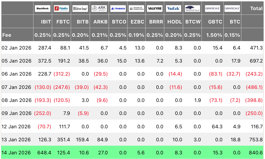 A SoSoValue adatai szerint szerdán 843,6 millió dollár friss tőke érkezett a spot Bitcoin ETF-ekbe, ami 2026 eddigi legnagyobb egynapos beáramlása.
