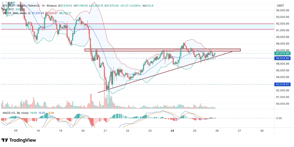 Jelenleg a Bitcoin felhalmozási szakaszban van, és várhatóan az 87.200–87.800 dolláros szűk konszolidációs tartomány marad érvényben a nap folyamán.