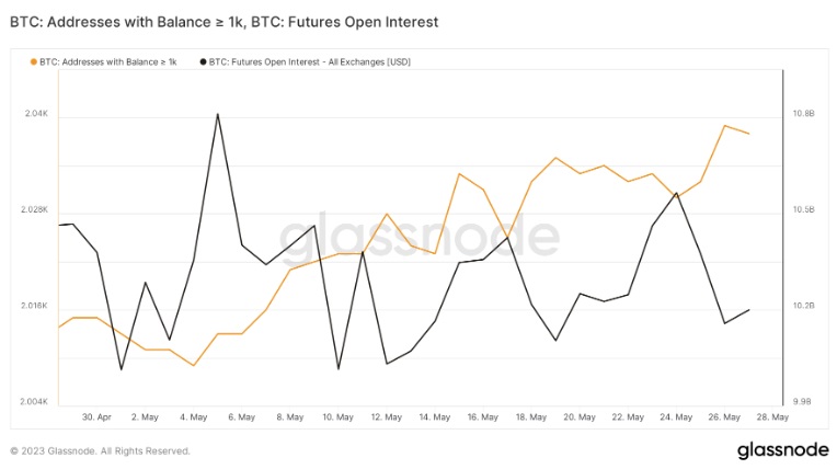 A határidős ügyletek nyílt kamatával való összehasonlítás fordított összefüggést mutatott. Úgy tűnik, hogy a bálnák mindig akkor halmoztak fel, amikor az Open Interest csökkenni kezdett, és akkor adtak el, amikor az Open Interest emelkedni kezdett.