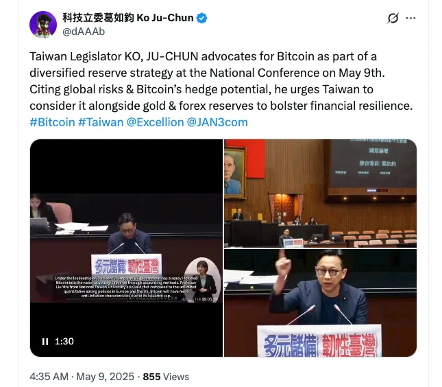 Ko, Tajvan törvényhozásának egyik listás képviselője pénteken az X-en számolt be róla, hogy május 9-én a Nemzeti Konferencián a kormány bitcoin befektetését javasolta.