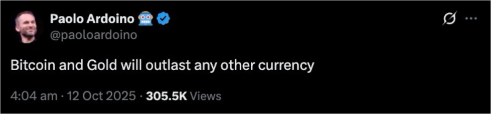 Paolo Ardoino hétvégi posztja az X-en egy olyan meggyőződést tükröz, amely már több mint két éve irányítja a Tether pénzügyi stratégiáját – a valódi értékek hosszú távon sikeresek.