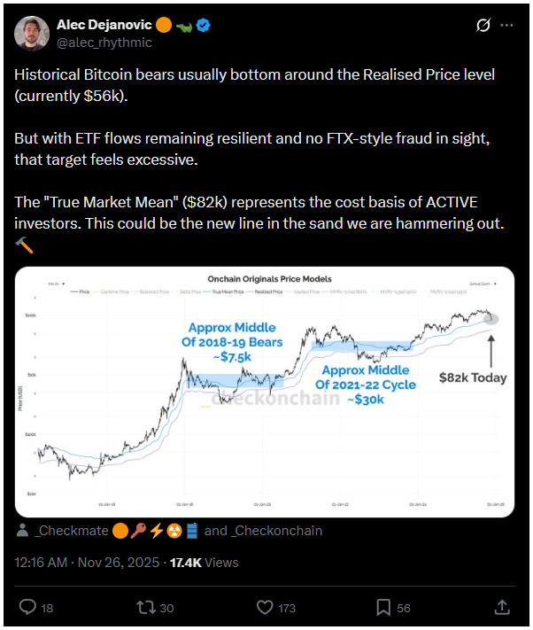 Alec Dejanovic, a Checkonchain alapítója egy friss posztban arról beszélt, hogy a Bitcoin történelmi mélypontjai gyakran az úgynevezett Realized Price, vagyis a „megvalósult ár” közelében alakultak ki.