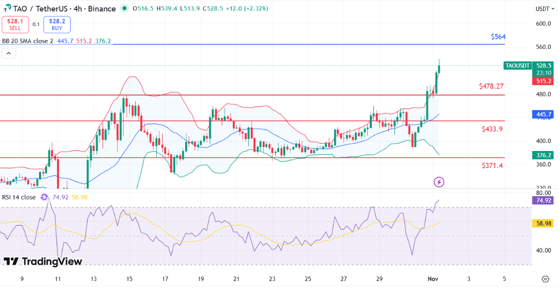 A TAO az elmúlt hetek szűk sávos kereskedése után erőteljes kitörést produkált, áttörve az 510 dolláros kulcsszintet.