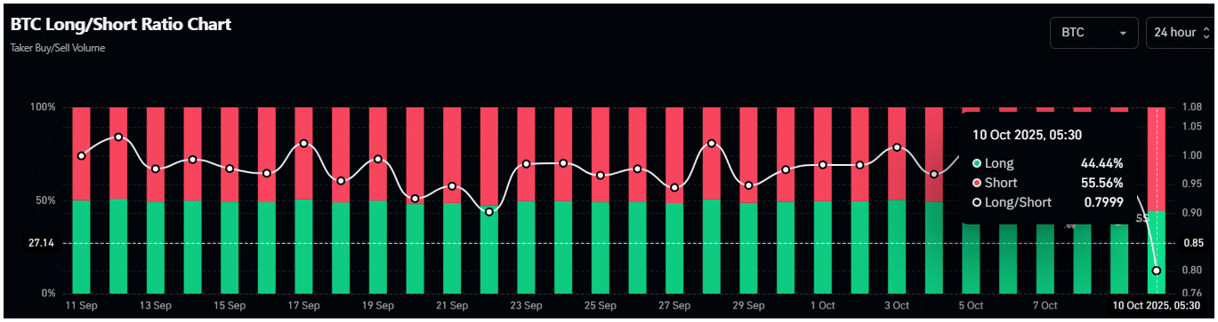 A Coinglass adatai szerint az összes nyitott pozíció 55%-a most short, ami +4%-os növekedés egy nap alatt – a legmeredekebb short-arány az elmúlt egy hónapban.