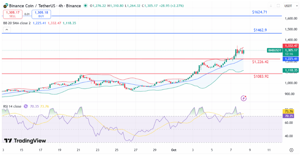 A BNB ismét a címlapokra került, miután új történelmi csúcsot ért el 1336,57 dolláron, ezzel megszilárdítva pozícióját mint a harmadik legnagyobb kriptovaluta piaci kapitalizáció alapján.