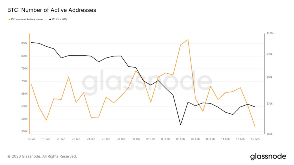 Az on-chain adatok további betekintést nyújtanak a BTC árfolyam alakulásába. Bár az ár stabilizálódott, a hálózati aktivitás továbbra is visszafogott.