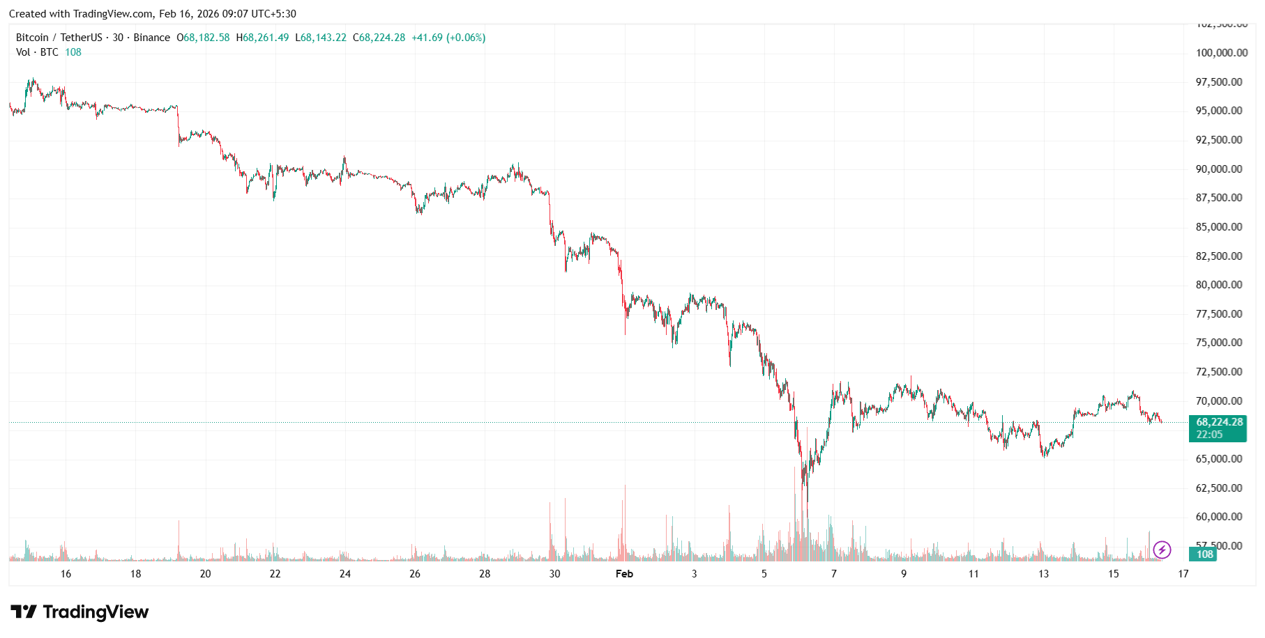 2026. február 16-án a BTC árfolyam egy konszolidációs zónában mozog. A piaci szereplők a csökkenő on-chain forgalmat és a kriptoökoszisztémában zajló infrastrukturális fejlesztéseket mérlegelik.