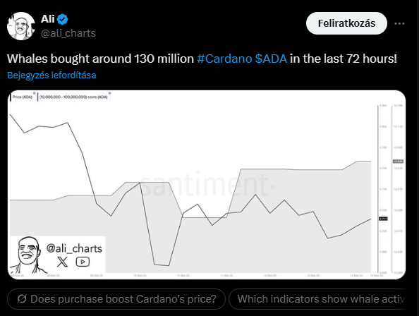 Egy X-en megosztott bejegyzés szerint a kriptobálnák az elmúlt 72 órában közel 130 millió ADA tokent vásároltak.