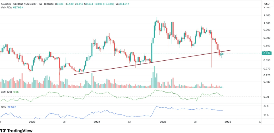 A Cardano jelenlegi mozgása nem gyengeséget, hanem türelmet mutat. A hosszú távú támaszok stabilak, a tőkeáramlási mutatók kedvezőek, és nincs nyoma pánikeladásnak.