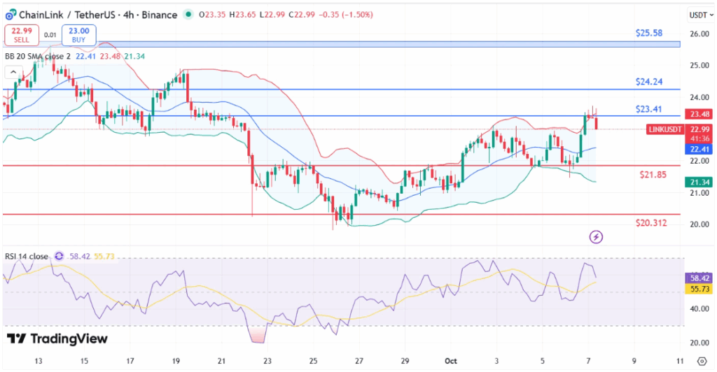 A 4 órás grafikon szerint a LINK árfolyama az ellenállási zónával birkózik 23,41 dollárnál.