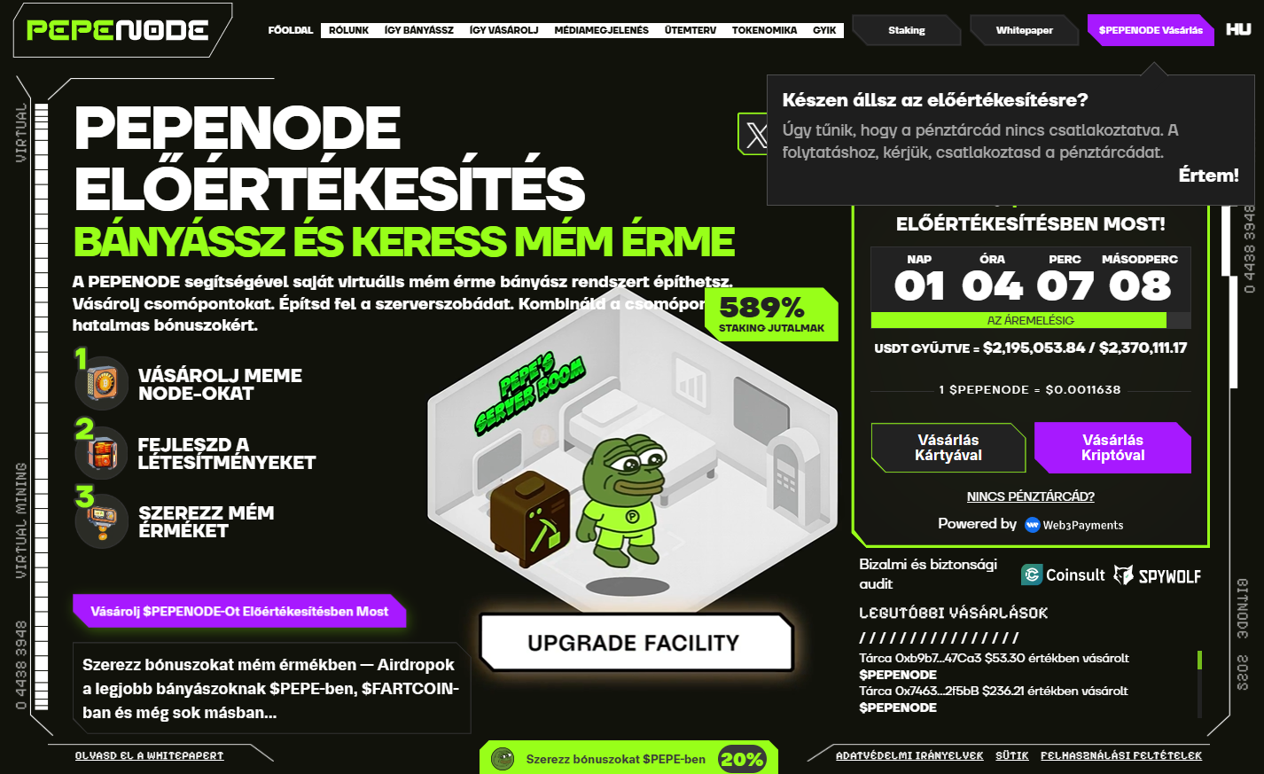 A PEPENODE egy „mine-to-earn” platform, ahol virtuális szervertermeket építhetsz, node-okat vásárolhatsz, és jutalmat szerezhetsz $PEPENODE tokenben.