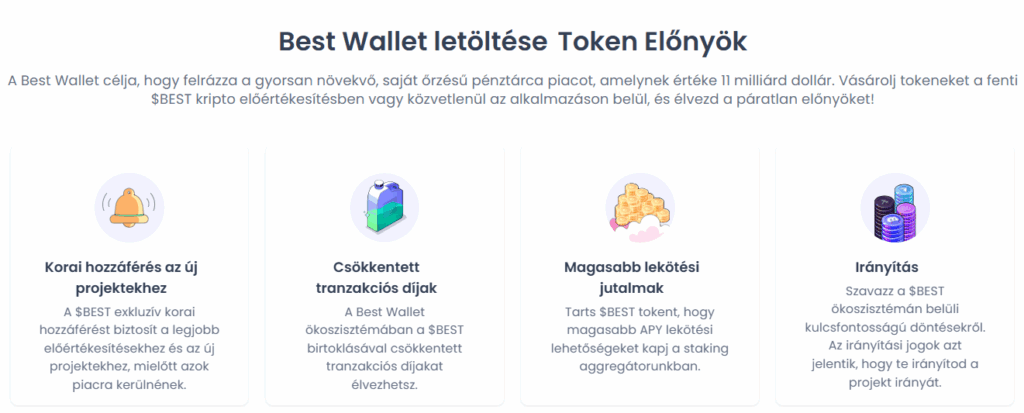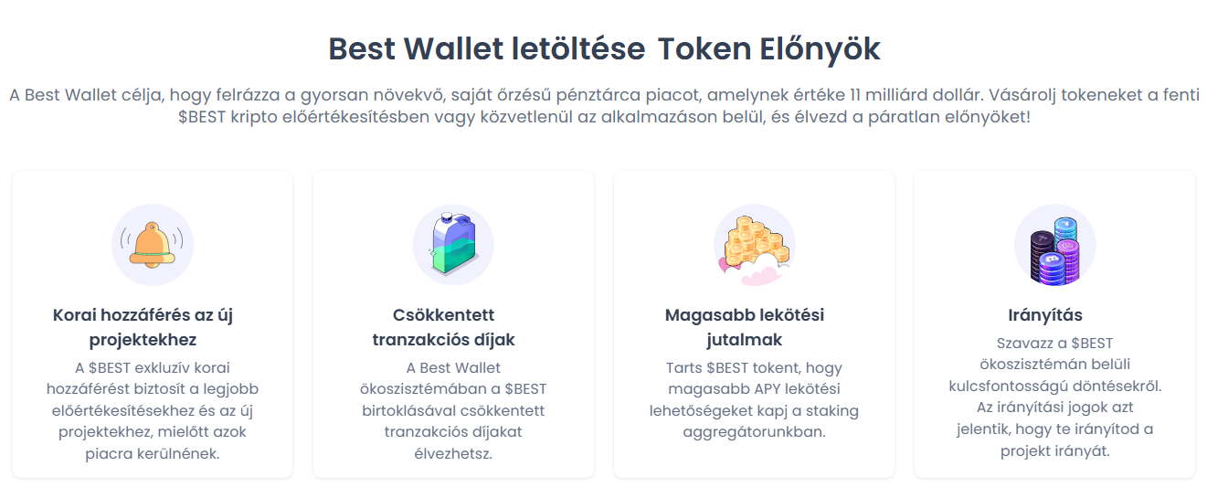 A tárca ökoszisztémájának középpontjában a saját érméje, a Best Wallet Token ($BEST) áll. A $BEST birtoklása kulcs a rendszer előnyeihez.