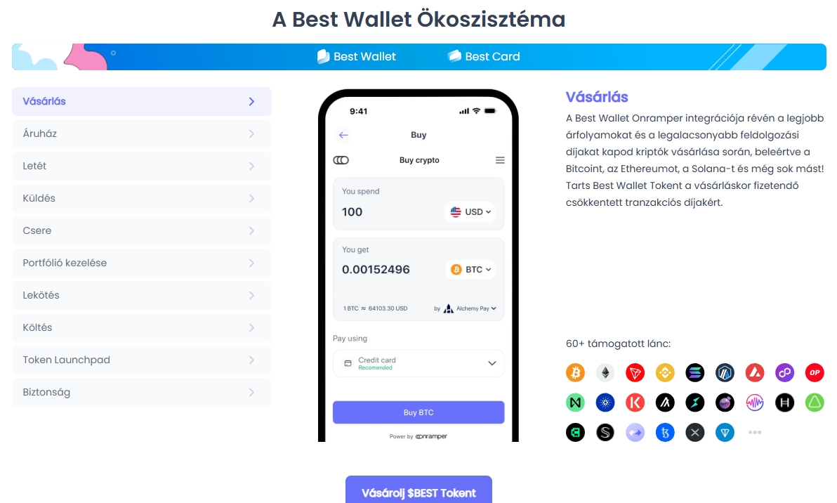 A Best Wallet egy mobilra optimalizált, nem letétkezelői, több láncot támogató tárca. Nagyon biztonságos, mégis könnyen használható.
