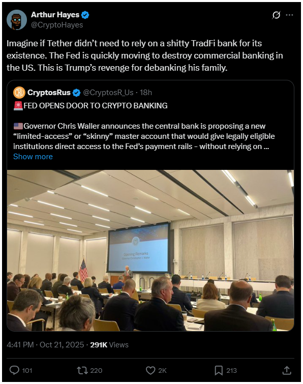 Hayes szerint, ha a Fed valóban engedélyezi, hogy a kriptovállalatok közvetlenül hozzáférjenek az elszámolási rendszerhez, azzal gyengítheti a kereskedelmi bankokat, miközben megerősítheti a decentralizált szereplőket, például a Tethert.