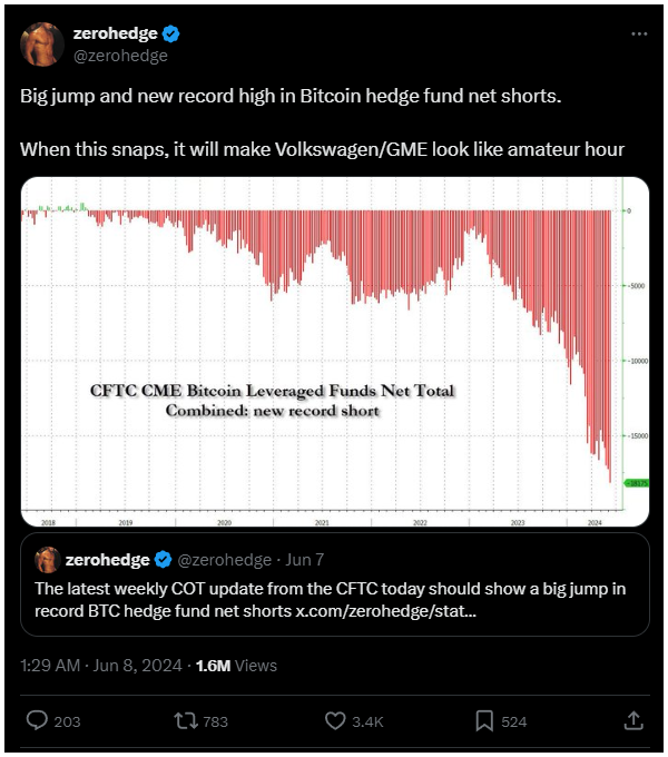 Június 7-én, amikor a BTC 68.450 dollárig zuhant, majd szerényen 69.000 dollár fölé emelkedett, a Zerohedge pénzügyi hírportál felhívást tett közzé az X közösségi médiaplatformon, kiemelve egy „nagy ugrást és új rekordot a bitcoin fedezeti alapok nettó shortolásában”.