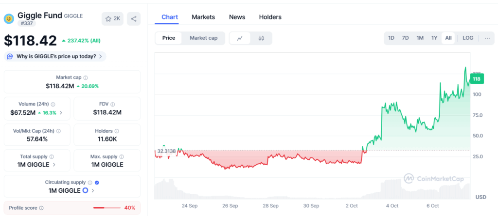 A piac is felfigyelt rá. A GIGGLE ára kedden több, mint 118 dollárra ugrott, ami 237,83%-os emelkedést jelent szeptember 24. óta, az értékelése pedig jelenleg 118,49 millió dollár.