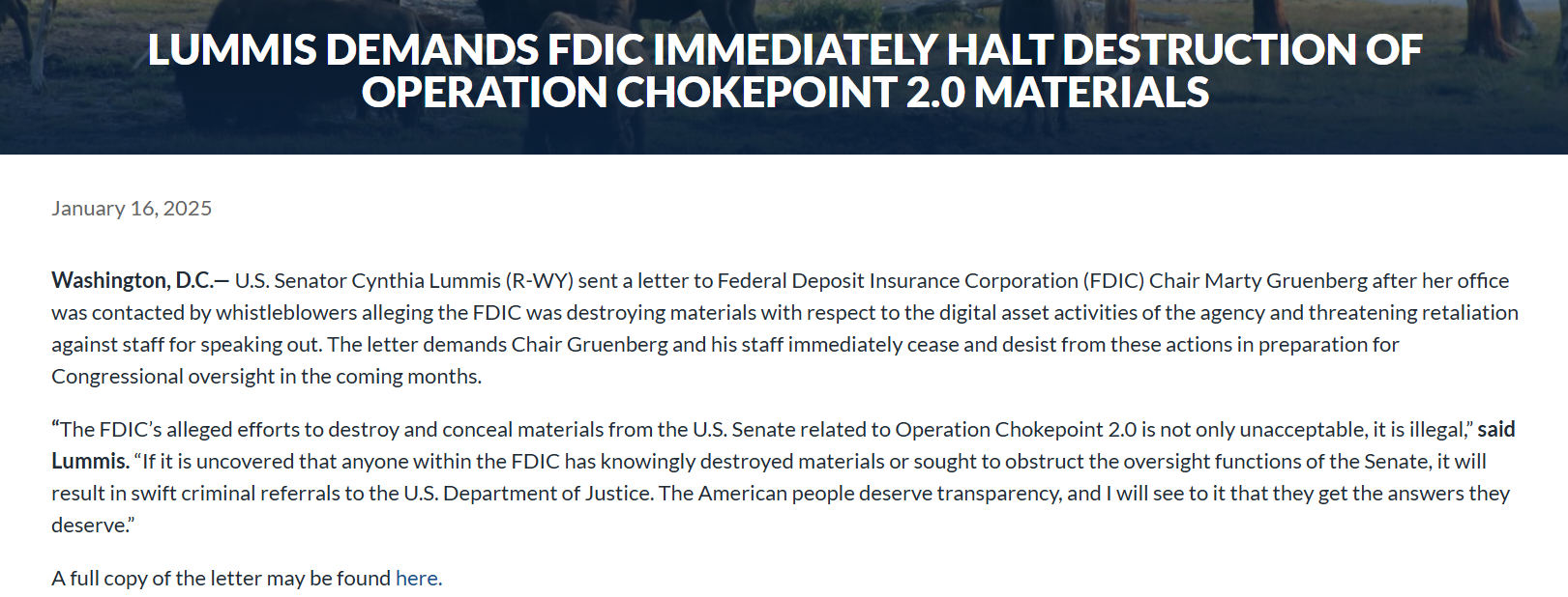 Lummis irodáját egy névtelen bejelentő kereste meg, aki azt állította, hogy a Szövetségi Betétbiztosítási Társaság (FDIC) „megsemmisíti az anyagokat”, amelyek az Operation Chokepoint 2.0-hoz kapcsolódnak.