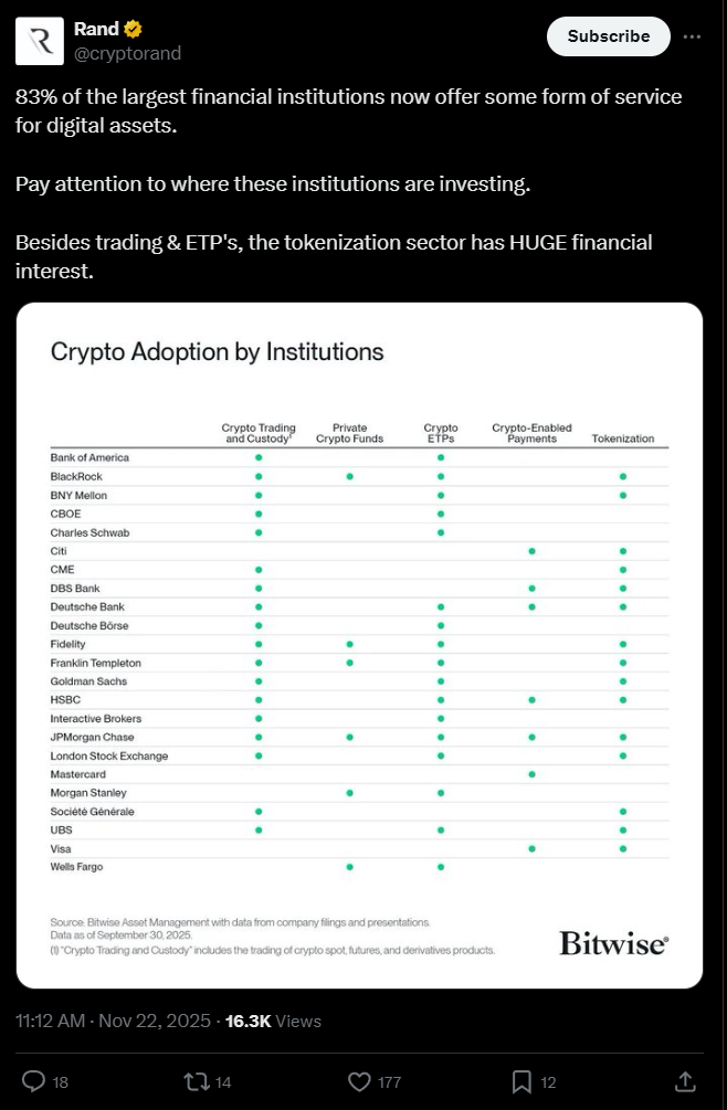 Ma már egészen más a helyzet. Bitwise adatai szerint a vezető pénzügyi intézmények 83%-a kínál valamilyen digitális eszközzel kapcsolatos szolgáltatást.
