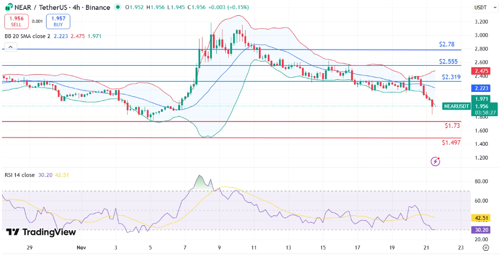 A kritikus támasz az 1,73-as éves mélypont. Ha a Bitcoin tovább süllyed, a NEAR könnyen csúszhat 1,50 felé.