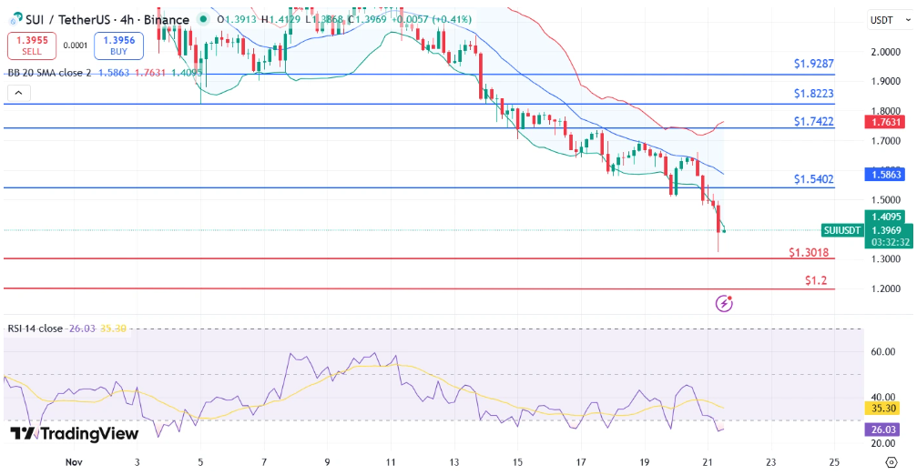 A harmadik nagy áldozat a Sui, amely 1,40 dollárig csúszott, 14%-os napi és 23%-os heti eséssel.