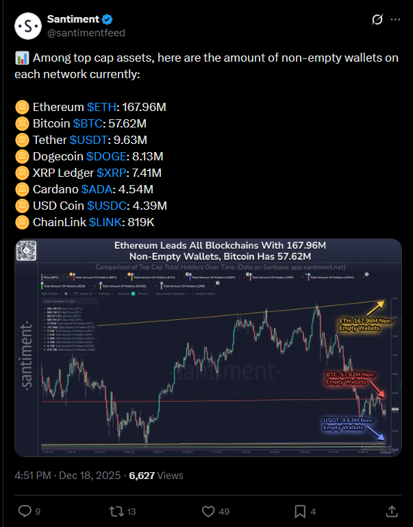 A blokklánc-elemzéssel foglalkozó Santiment nemrég közzétett egy érdekes elemzést, amely megmutatja, hogyan teljesít a Bitcoin, az Ethereum, a Dogecoin és néhány más nagy kriptovaluta a nem üres tárcacímek száma alapján.