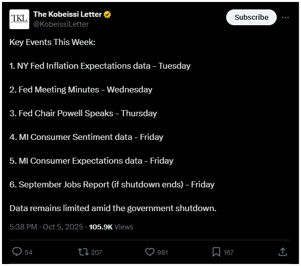 A következő héten több Fed-beszéd és fogyasztói bizalmi jelentés várható, bár a leállás miatt a gazdasági aktivitás visszafogott marad.