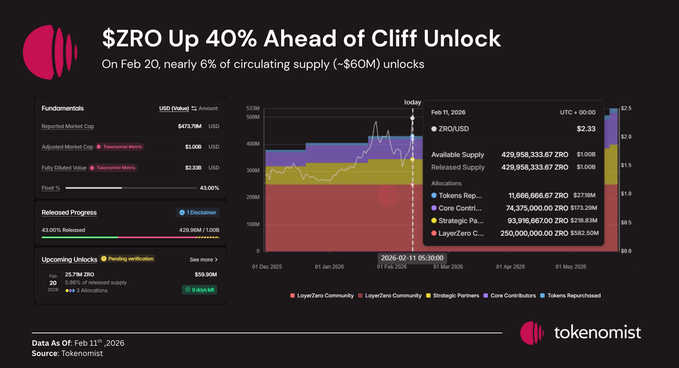 Ezzel párhuzamosan a piac egy február 20-ra tervezett cliff unlock eseményre készül, amely során a ZRO forgalomban lévő kínálatának közel 6%-a, nagyjából 60 millió dollár értékben, kerülhet piacra.