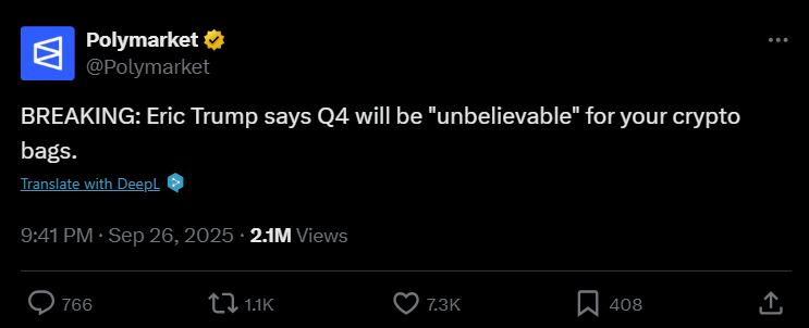 Ahogyan azt a Polymarket is hírül adta az X-en, Eric Trump úgy gondolja, hogy a negyedik negyedév „hihetetlen a kriptó számára”.