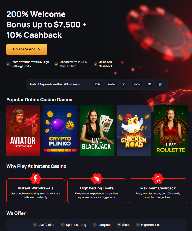 1.Instant Casino – A legjobb online kaszinó kezdőknek, heti 10% pénzvisszatérítéssel